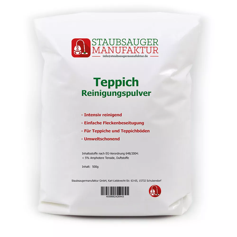 Universal einsetzbares Teppich- bzw. Reinigungspulver für alle farbechten textilen Bodenbelege aus eigener Produktion der Staubsaugermanufaktur. Das Mittel ist vergleichbar mit dem bekannten Kobosan von Vorwerk.