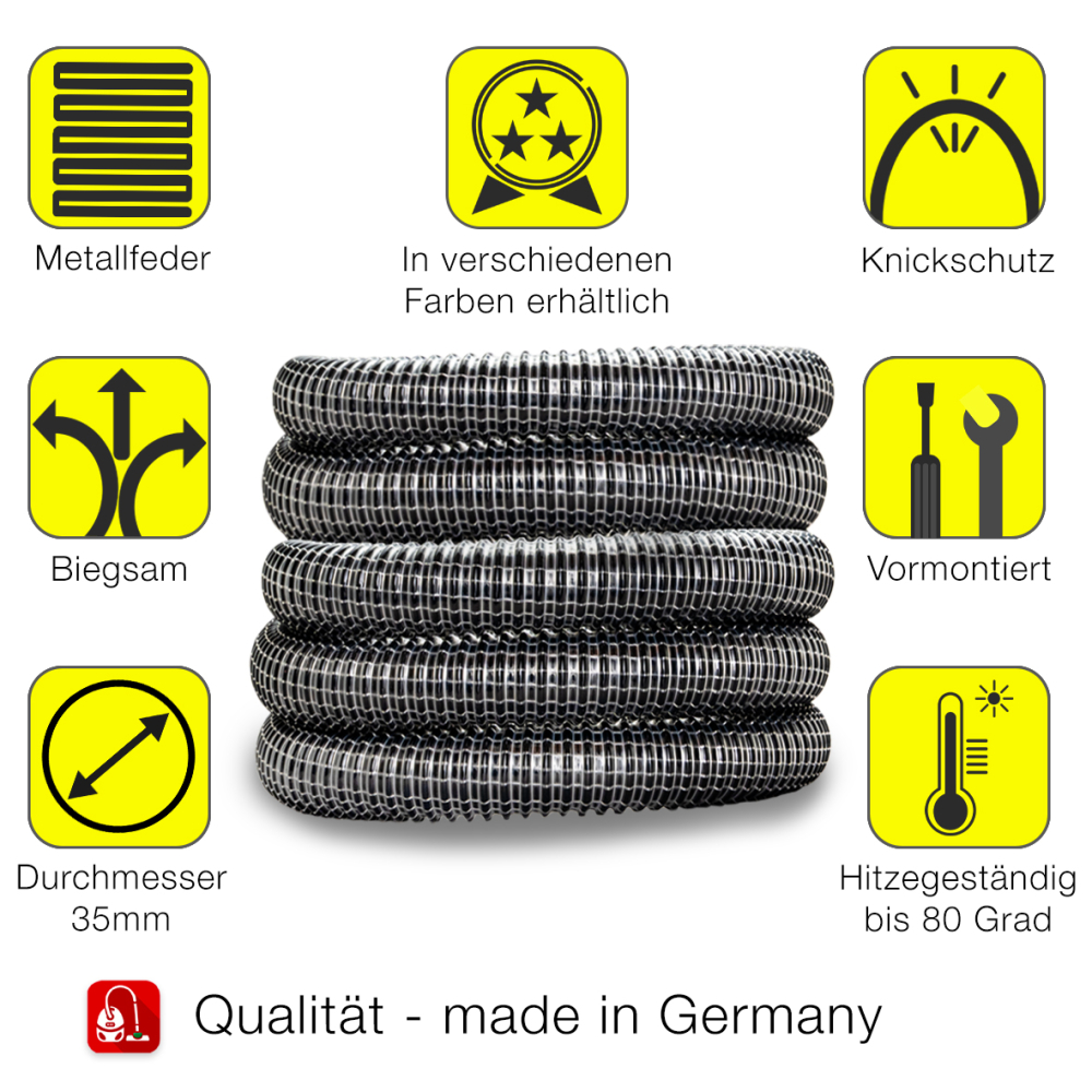 Entdecken Sie unseren widerstandsfähigen Gewebeschlauch mit innenliegender Stahlfeder und Maschinenanschluss, perfekt für den Einsatz mit Industriestaubsaugern. Dieser hochwertige Schlauch ist ideal zum effizienten Absaugen von Staub, Spänen sowie Luft und gasförmigen Medien und eignet sich hervorragend für die Absaugtechnik und den Anlagenbau.