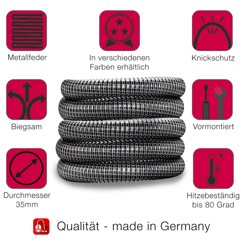 Entdecken Sie unseren widerstandsfähigen Gewebeschlauch mit innenliegender Stahlfeder und Maschinenanschluss, perfekt für den Einsatz mit Industriestaubsaugern. Dieser hochwertige Schlauch ist ideal zum effizienten Absaugen von Staub, Spänen sowie Luft und gasförmigen Medien und eignet sich hervorragend für die Absaugtechnik und den Anlagenbau.