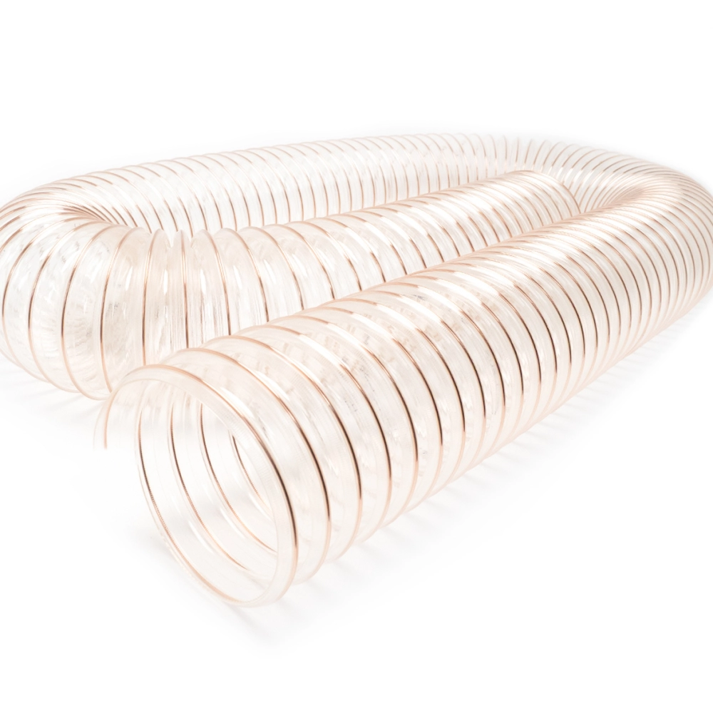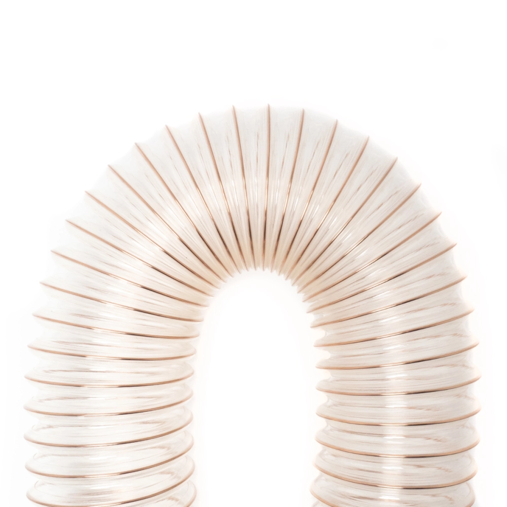 Antistatischer, leichter Absaugschlauch aus abriebfestem Polyurethan mit in der Wandung eingebetteter, ummantelter Federstahlspirale für Absauganlagen.