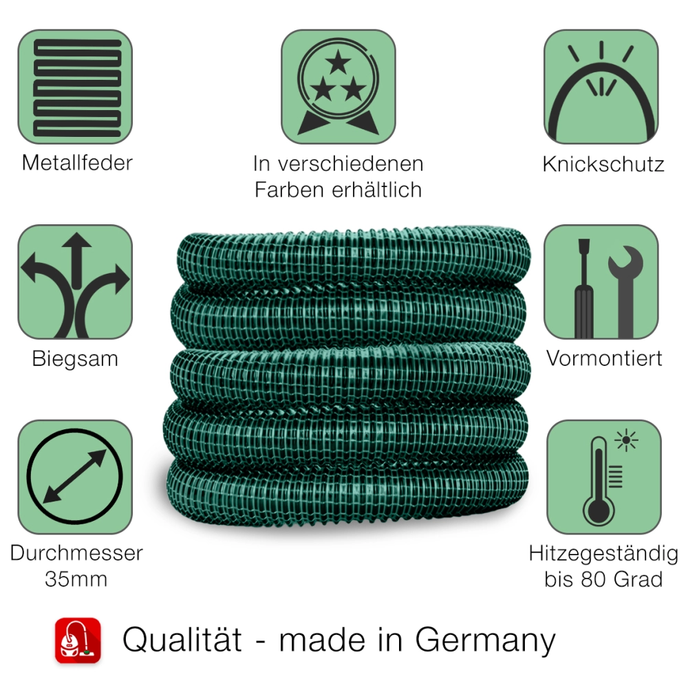 Dank seiner robusten Konstruktion und der innenliegenden Stahlfeder bietet dieser Gewebeschlauch eine ausgezeichnete Stabilität und verhindert ein Zusammenfallen, selbst unter starkem Unterdruck. Der Maschinenanschluss sorgt für eine sichere Verbindung und minimiert das Risiko von Leckagen oder Ausfällen während des Betriebs.